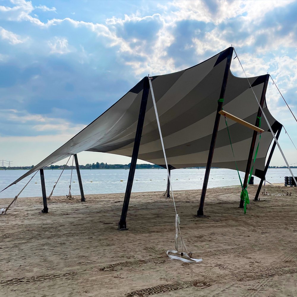 De Seagull is een imposante luifel. Karakteristieke houten Douglas-palen, dragen het doek dat komt in zwart-grijs-bruin-wit-tinten. Het verrijkt elk outdoor festival of evenement. Ideaal tegen regen of zon, of als dj-of baroverkapping.