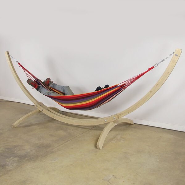 De Hammock solo heeft een stevige maar lichte, houten basis die tot 150 kilogram kan dragen.